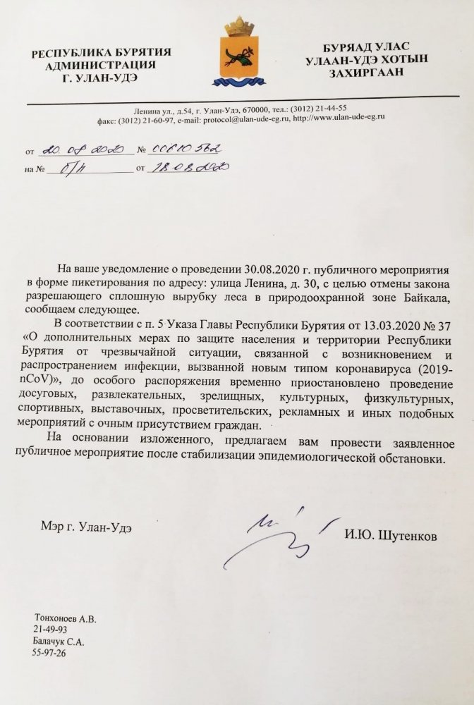 30 августа инициативная группа планировала провести пикет за отмену федерального закона, разрешающего сплошную вырубку леса в природоохранной зоне Байкала. Чиновники ответили, что рекомендуют провести мероприятие после стабилизации эпидемиологической обстановки.