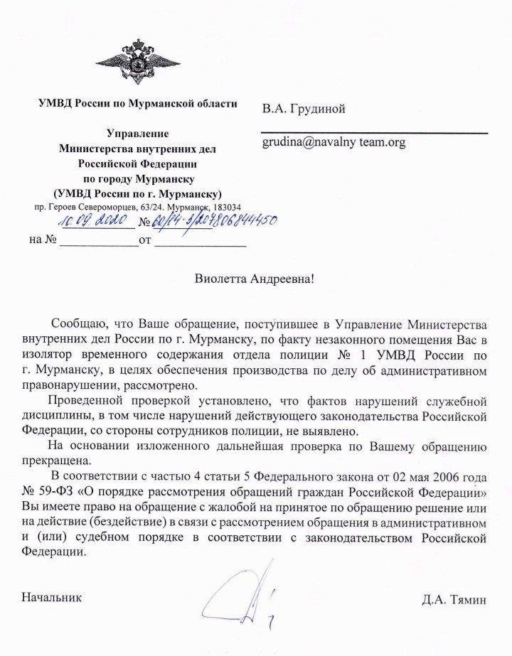 Координатор штаба Навального в Мурманске Виолетта Грудина получила ответ из МВД по своей жалобе на незаконные действия полицейских, которые оставили ее в отделе на ночь после задержания на акции 20 августа. Проверка не обнаружила нарушений в действиях полицейских, пишет ведомство. Об этом сообщается в телеграм-канале штаба.