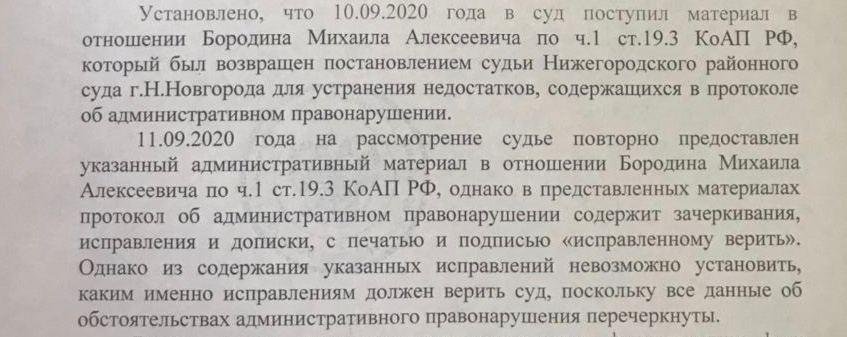 17:56 «Апология протеста» уточняет, что у Бородина сегодня снова состоялось заседание суда. Протокол в отношении задержанного повторно отправили на исправление в полицию. Правозащитный проект опубликовал фото постановления: