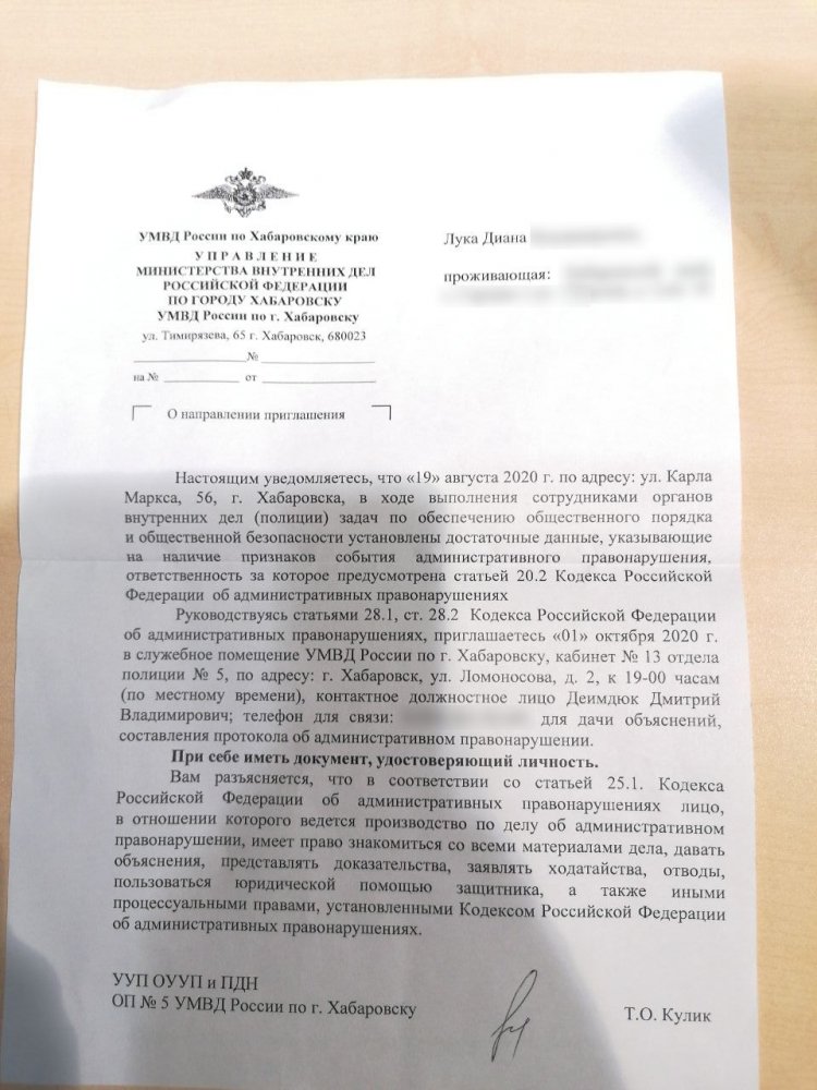 Вечером 1 октября Демидюк снова пришел в магазин с другим неизвестным, который вел видеосъемку. Он вручил письмо от УМВД по Хабаровску о направлении приглашения уже в 5-й отдел полиции для составления протокола по статье 20.2 КоАП (по какой части — не уточняется). Демидюк так и не доказал свою принадлежность к правоохранительным органам, вновь предъявил только гражданский паспорт, а не служебное удостоверение, и не разъяснил Луке ее права, как она просила.