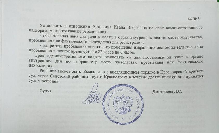 При этом регулярные беседы с сотрудниками ЦПЭ не являются частью обязанностей, возложенных на Асташина по решению суда. Суд в конце июля обязал его отмечаться два раза в месяц в ОВД и пребывать по месту жительства с 22:00 до 6:00.