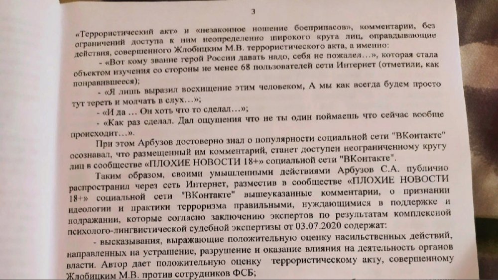 В частности, Арбузову вменили, что он 1 ноября 2018 года написал: «Вот кому звание герой России давать надо, себя не пожалел». Как пишет Гужев, обвиняемый признал вину, раскаялся и в течение всего хода следствия активно сотрудничал с обвинением.
