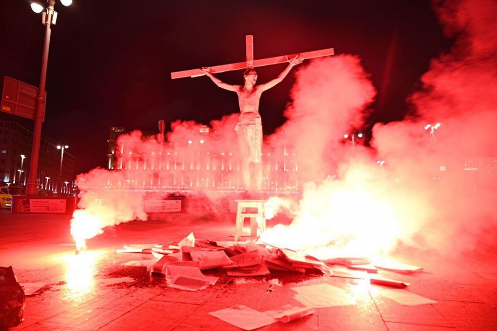 «Активисты собирались провести акцию в поддержку политзаключенных, в ходе нее они облили крест веществом, которое горит при 40℃ и не наносит человеку вреда. На кресте был „распят“ активист, а его соратники кидали в огонь тома уголовных дел» — сообщает «МБХ медиа».