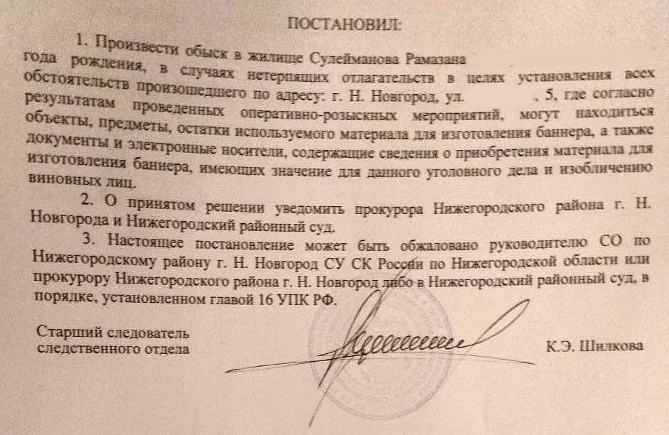 Как стало известно, Сулейманова подозревают по уголовному делу о неуважении к суду (ч. 2 ст. 297 УК) из-за баннера, который вывесили 13 ноября на заборе Нижегородского районного суда. Правозащитный центр «Мемориал» в Нижнем Новгороде опубликовал постановление о возбуждении уголовного дела.