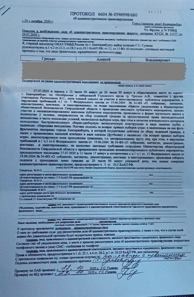 Протокол по статье о нарушении порядка проведения публичного мероприятия (ч. 5 ст. 20.2 КоАП) активист получил по почте. Как указано в бумагах, полиция расценила сбор подписей 27 июля как несогласованный массовый пикет с использованием сборно-разборной конструкции.