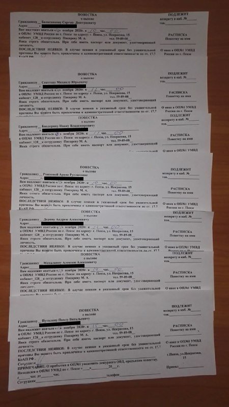 Накануне полицейские принесли в офис партии восемь повесток с приглашением в отдел полиции № 1 на составление протоколов. Повестки были оформлены как на участников Ленинского комсомола, так и на гражданских активистов, которые выходили в одиночные пикеты вместе с ними. Сотрудники полиции пообещали, что тех, кто не явится по повестке, будут искать на работе, на учебе и «ловить» на улице.