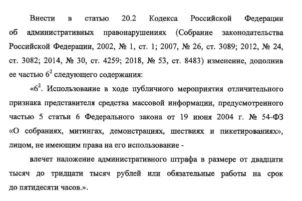 Так, согласно одной из инициатив депутата от 23 ноября, в статью 20.2 КоАП (нарушение установленного порядка организации либо проведения собрания, митинга, демонстрации, шествия или пикетирования) планируется внести часть 6.2, которая будет предусматривать штраф за ношение во время акции отличительного знака СМИ человеком, у которого нет на это права.
