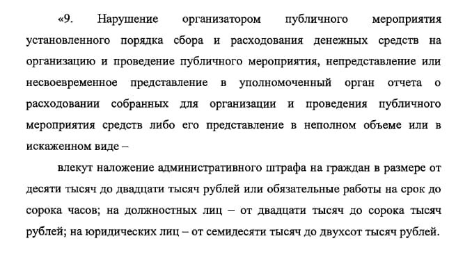 По части 9 будут привлекать к ответственности за нарушение порядка сбора и расхода денежных средств, либо за непредставление отчета уполномоченным органам информации о тратах собранных средств.