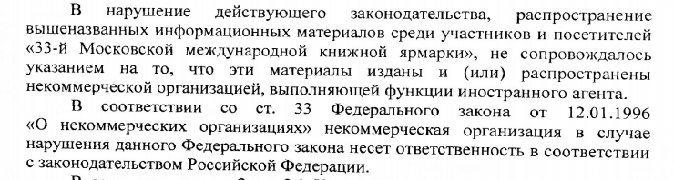«В составленный по результатам проверки акт был внесен целый ряд наших изданий, в том числе те, которые были изданы задолго до введения законодательства об [организациях] — „иностранных агентах“. В частности был взят каталог Музея Мемориала, изданный в 1998 году. На стенде у Международного Мемориала имеется специальный штамп с информацией о внесении в реестр, который мы ставим в старые книги, если посетители хотят такие книги получить. Нам не дали возможности поставить на взятые прокуратурой книги этот штамп», — приводит «Международный Мемориал» слова исполнительного директора Елены Жемковой.