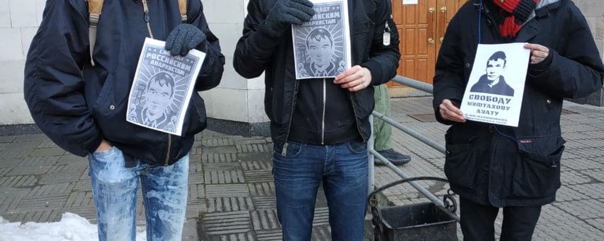 Пикетчики стояли с плакатами «Свободу российским анархистам» и «Свободу Азату Мифтахову». У ОВД-Инфо пока нет данных, как зовут задержанных и в какой отдел их повезли.