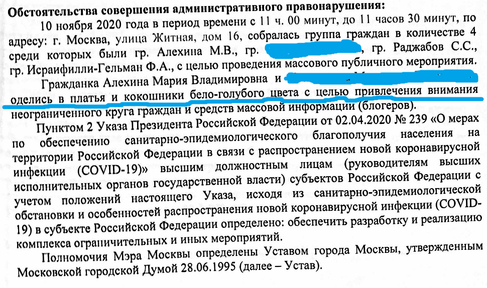 Девушек признали виновными по статье о нарушении режима самоизоляции в период пандемии (ч. 1 ст. 20.6.1 КоАП). Согласно протоколам, они собрались вместе «с целью проведения массового публичного мероприятия» и оделись в платья и кокошники, чем создали угрозу распространения коронавирусной инфекции.