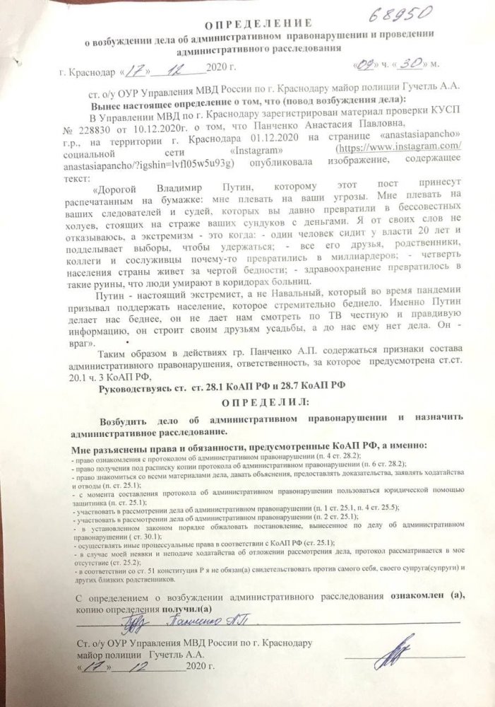 Краснодарская полиция завела на главу местного штаба Навального Анастасию Панченко административное дело из-за поста в инстаграме. Об этом сообщает адвокат Панченко Михаил Беньяш.