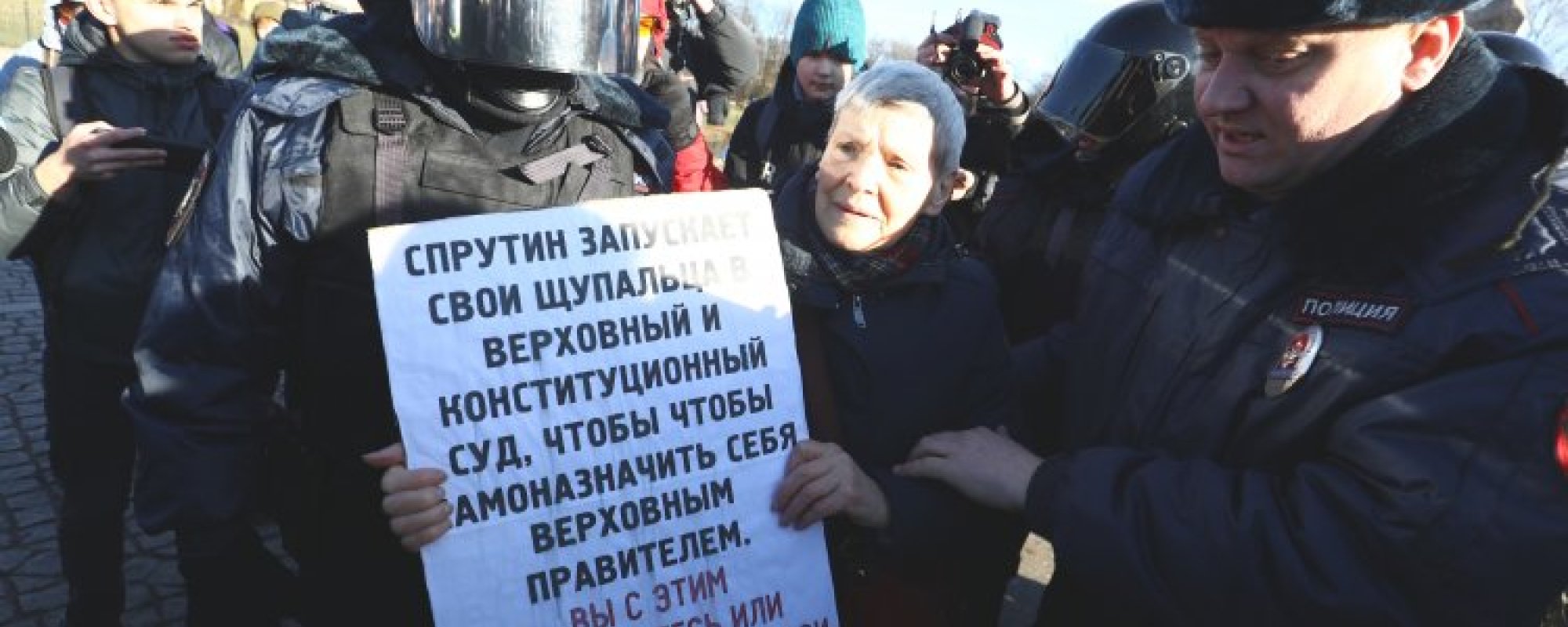 «Приятная дама вышла с плакатом, на котором было написано что-то вроде „Спрутин запустил щупальцы в Верховный суд и в Конституционный суд“. Она стояла совершенно без признаков экстремизма. Вокруг были люди, она тихим спокойным голосом говорила, что мы живем в ужасное время, нужно иметь совесть… Ни возгласов, ни призывов никаких она не делала. Подошел полноватый майор без бронежилета — он есть на всех видео. По его указанию на даму напали двое с дубинками, рациями и в спецобмундировании», — рассказывал о задержании Валерии Гнусаревой лидер инициативы «Бездомный дольщик» Александр Головко.