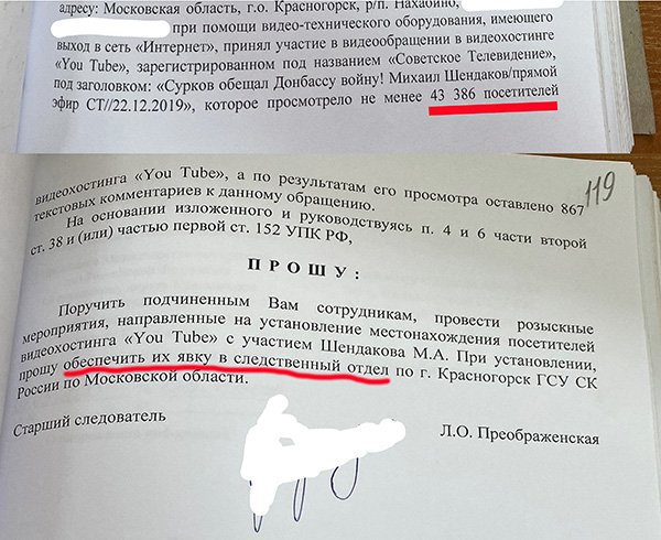 Согласно документам, которые оказались в распоряжении журналистов, старший следователь Преображенская Л. О. направила просьбу начальнику УМВД по Красногорску «обеспечить явку» в следственный отдел зрителей ролика Шендакова. В запросе указано, что ролик с заголовком «Сурков обещал Донбассу войну! Шендаков/прямой эфир СТ//22.12.2019» посмотрело более 43 тысяч посетителей YouTube.