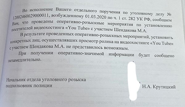 На просьбу следователя ответил начальник отдела уголовного розыска Н. А. Крутицкий, написав, что «установить конкретных лиц, осуществлявших просмотр ролика на видеохостинге „YouTube“ с участием Шендакова М. А. не представилось возможным».