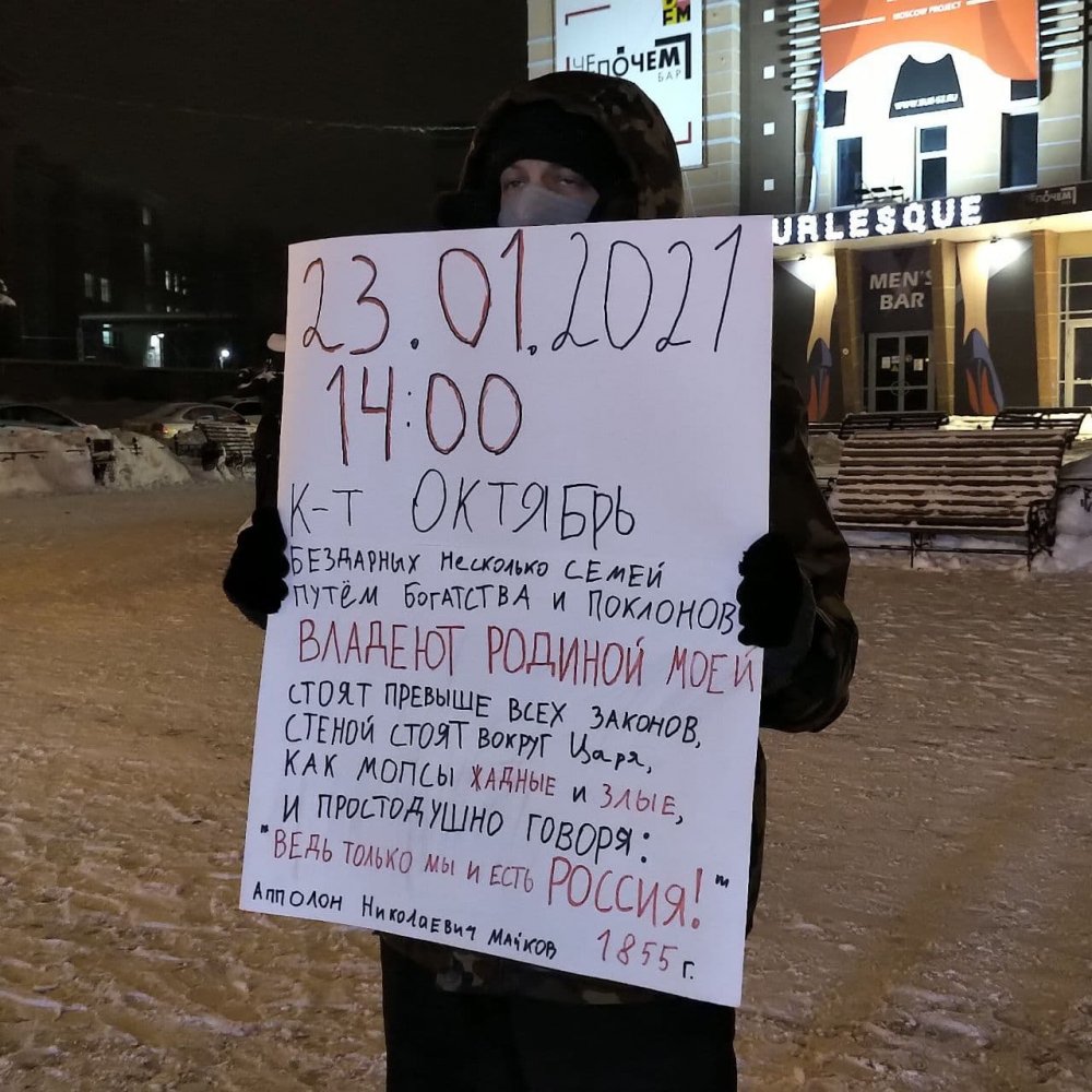 «Данный гражданин осуществлял организацию публичного мероприятия, а именно посредством наглядной агитации призывал к участию в публичном мероприятии 23.01.2021 в 14-00», — пишут полицейские в протоколе.