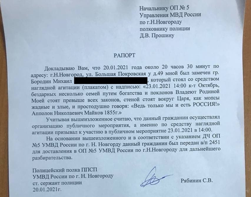 Бородин стоял с плакатом, на котором была информация об акции 23 января в поддержку арестованного Алексея Навального. Задержанного доставили в ОП № 5 Нижнего Новгорода.