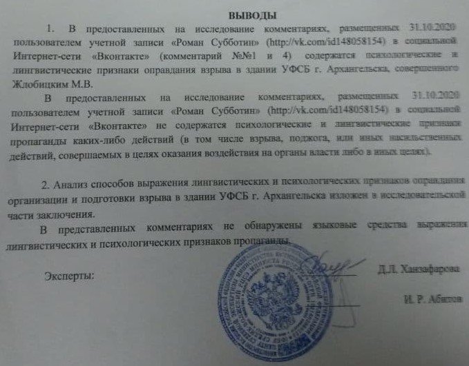 Эксперты исследовали четыре комментария, которые Субботин якобы оставил в 2018 году под публикацией в сообществе «29.ru новости Архангельска» о взрыве в УФСБ Архангельска. В двух из них, решили эксперты, содержатся «психологические и лингвистические признаки оправдания взрыва».