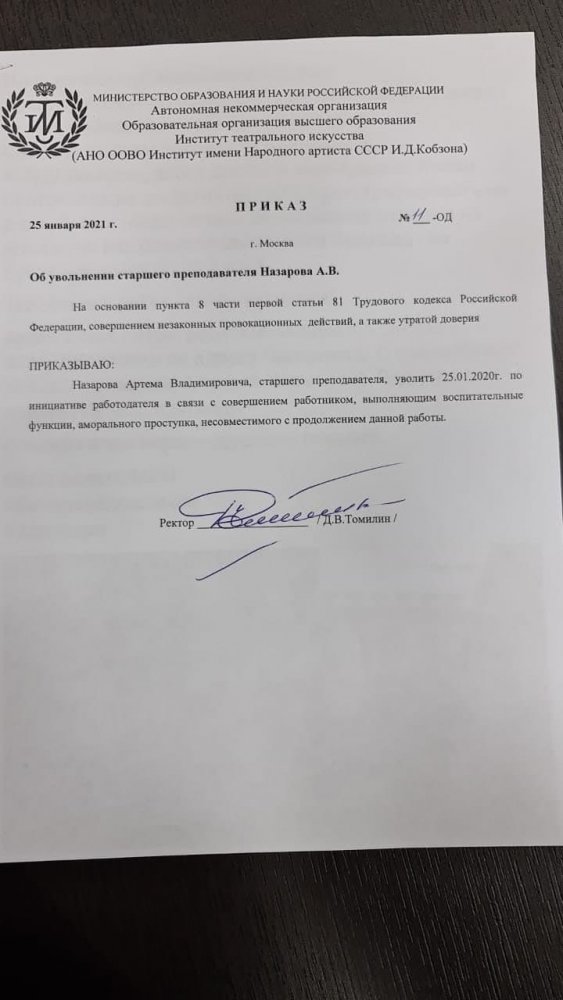 Руководство московского Института театрального искусства имени Иосифа Кобзона уволило старшего преподавателя Артема Назарова из-за участия в акции 23 января. Об этом он сам рассказал ОВД-Инфо.