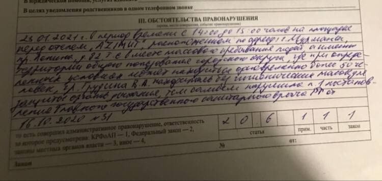 Поводом для составления протокола стала акция 23 января в поддержку Алексея Навального, которая прошла на площади в центре Мурманска. По версии полиции, Грудина присутствовала на площади во время публичного мероприятия без маски.