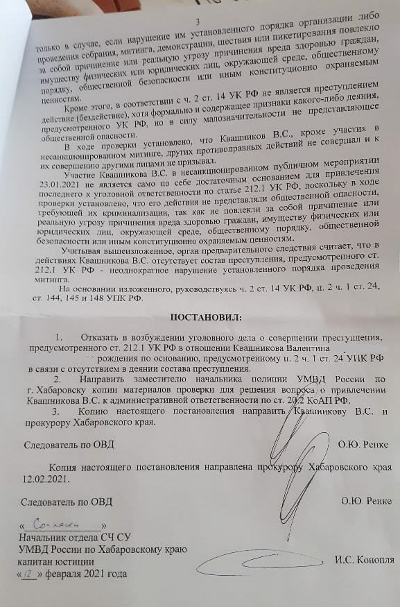 2 марта Адвокат от ОВД-Инфо Андрей Битюцкий получил уведомление и постановление об отказе в возбуждении уголовного дела против Квашникова.