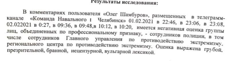 Протокол на Шамбурова составили из-за сообщений в телеграме и видеообращения на выходе из спецприемника, где он отбывал девять суток ареста после задержания на акции 23 января. В своих репликах активист употребил бранные слова. Эксперт-филолог исследовал высказывания Шамбурова и пришел к выводу, что они относятся к полицейским — «группе лиц, объединенных по профессиональному признаку».