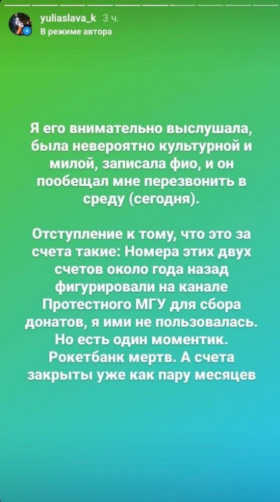 «Протестный МГУ» опубликовал содержание опроса. Старший оперуполномоченный по особо важным делам Артур Деликов интересовался двумя счетами, рублевым и долларовым, в Рокетбанке (филиал «Qiwi банк»), открытыми полтора года назад на имя Юлиаславы (Юлии) Королевич. По словам старшего оперуполномоченного, эти счета указаны на ресурсах организации «Инициативная группа МГУ», которая «выступает против политики президента действующего и действующих органов государственной власти». Запрос в ОЭБиПК УВД по САО поступил из УВД по ЗАО, на территории которого находится МГУ, пояснил старший оперуполномоченный.