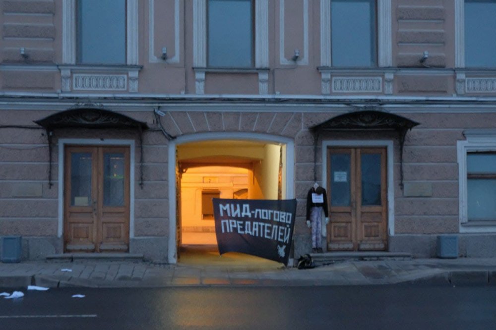 Днем ранее, 5 апреля, члены «Другой России Э. В. Лимонова» провели акцию в честь годовщины Ледового побоища напротив представительства МИД. Активисты вывесили баннер с надписью «МИД — логово предателей», а также «повесили» куклу с табличкой «Я — русский, меня предал Кремль». Как пишет телеграм-канал «ЛЕНИНГРИБ», акция символизирует «брошенных отечественными чиновниками соотечественников за границами РФ».