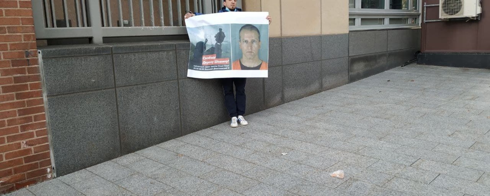 Ткач развернул плакат «Свободу Дереку Шовину» и приковал себя наручниками к посольству. Его с применением силы задержали трое полицейских, плакат порвали. Рэпера доставили в ОВД «Пресненский».