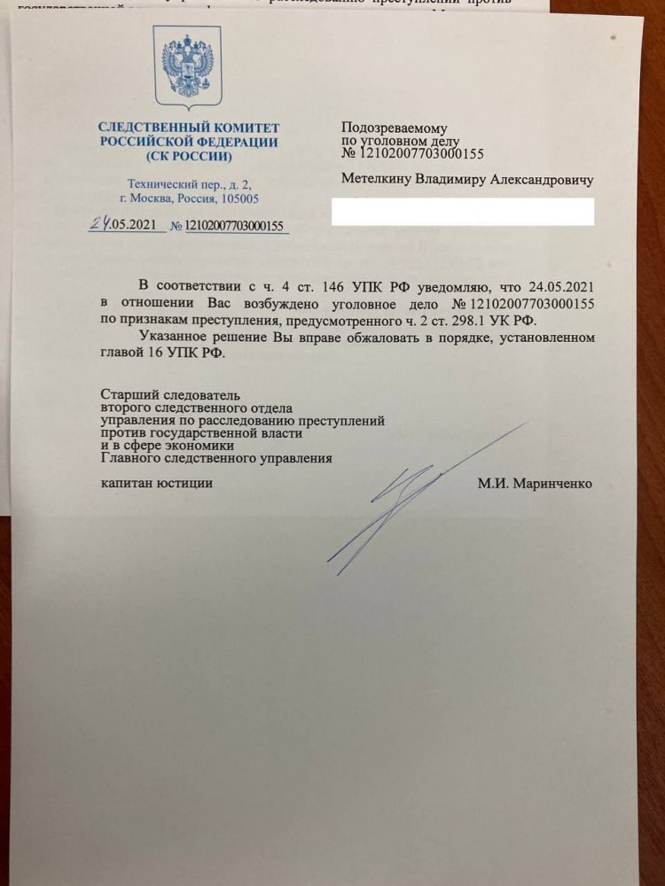 Метелкину вменяют статью о клевете (ч. 2 ст. 298.1 УК). По мнению силовиков, он оклеветал следователя в связи с производством предварительного расследования по своему первому уголовному делу — о вовлечении несовершеннолетних в деятельность, опасную для их жизни (ст. 151.2 УК). В чем именно усматривается клевета, Павел Чиков не уточняет.