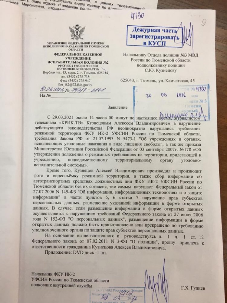 Журналиста «КРИК-ТВ» Алексея Кузнецова 26 мая оштрафовали на 20 тысяч рублей за голодовку у здания исправительной колонии № 2 в Тюмени. Об этом он сообщил на своей странице во «ВКонтакте» и на YouTube-канале «ТЮРЬМА- LIFE», карточка дела опубликована на сайте суда.