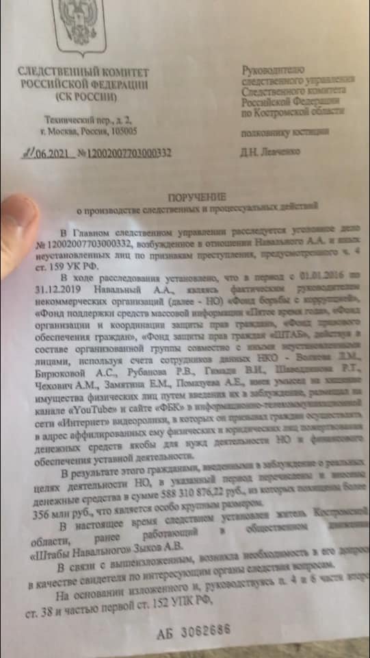По словам задержанного, его собираются допросить по новому уголовному делу против Алексея Навального — по статье о мошенничестве (ч. 4 ст. 159 УК). Навального обвиняют в том, что он и его сотрудники пытались похитить пожертвования, вводя людей в заблуждение и выкладывая в интернет ложную информацию.