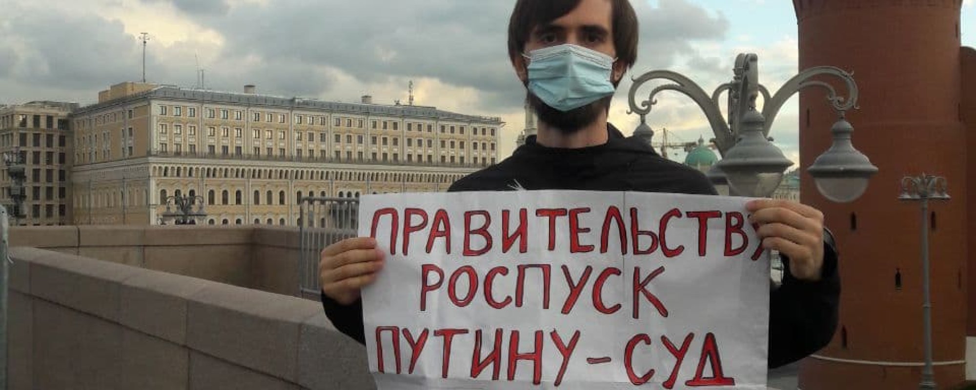 Пикетчик стоял с плакатом «Правительству — роспуск. Путину — суд. Судьям — тюрьму. Стране — жизнь. Людям — свободу». По словам свидетелей, задержанного отпустили без протокола.