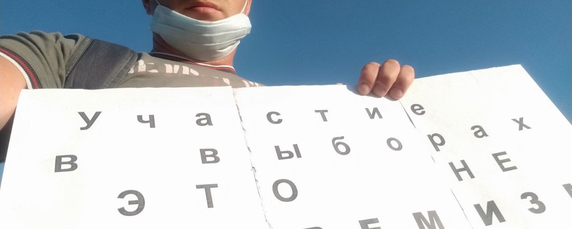 Пикетчик стоял с плакатом «Участие в выборах — это не экстремизм #Свободу Навальному #Свободу Пивоварову #Свободу политзаключенным».