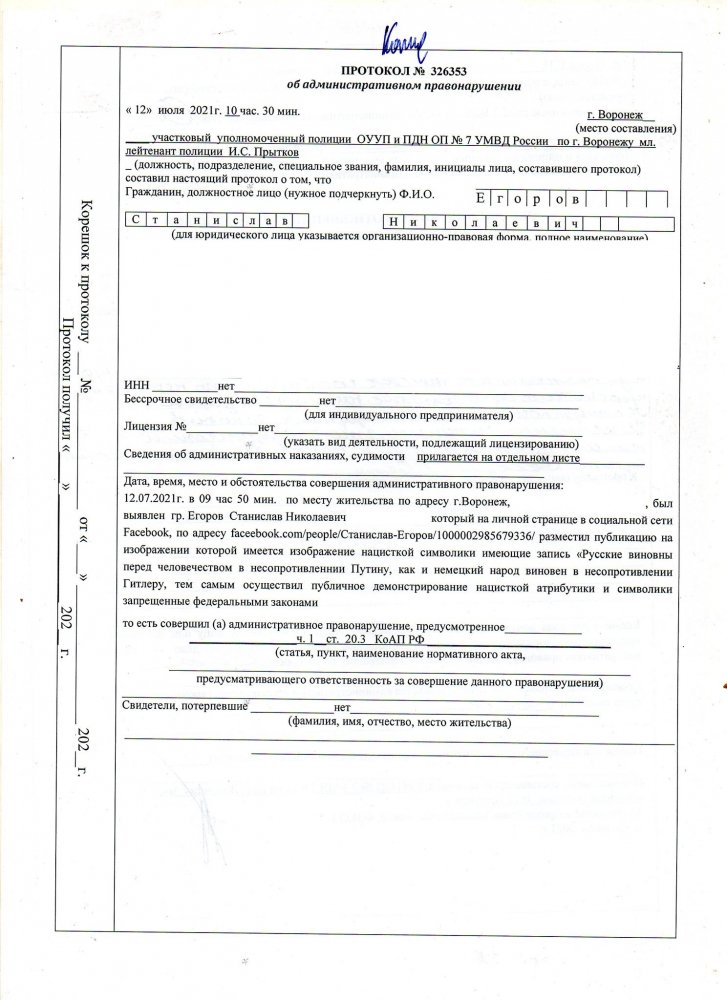 Согласно протоколу, в посте была опубликована фотография Путина на фоне свастики с подписью «Русские виновны перед человечеством в несопротивлении Путину, как и немецкий народ виновен в несопротивлении Гитлеру». По словам Егорова, он не выкладывал такой пост.