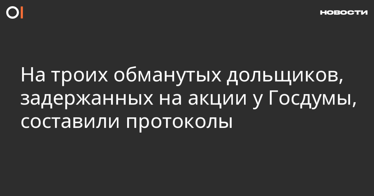 В Москве на троих обманутых дольщиков, задержанных в июле у здания Госдумы, составили протоколы о нарушении порядка проведения публичного мероприятия (ч. 5 ст. 20.2 КоАП). Среди тех, на кого составили протоколы, Юрий Щепинов и Григорий Костюнин. Об этом сообщает адвокат от ОВД-Инфо Сергей Тельнов, защищающий дольщиков.