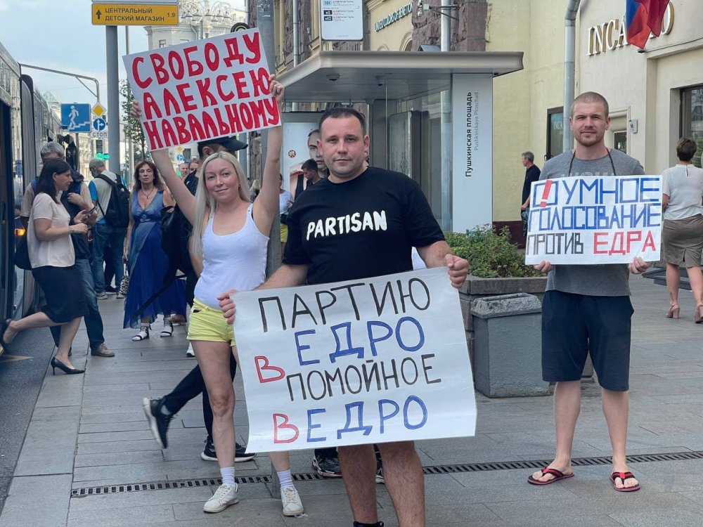 Гражданские активисты держали плакаты с надписями «Умное голосование против ЕДРА», «Свободу Алексею Навальному» и