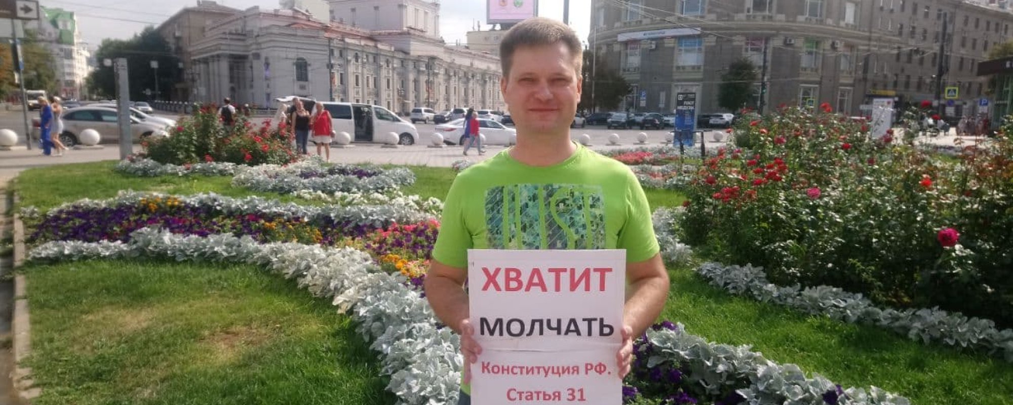 Пикетчик держал плакат с надписью «Хватит молчать» и текстом 31-й статьи Конституции.