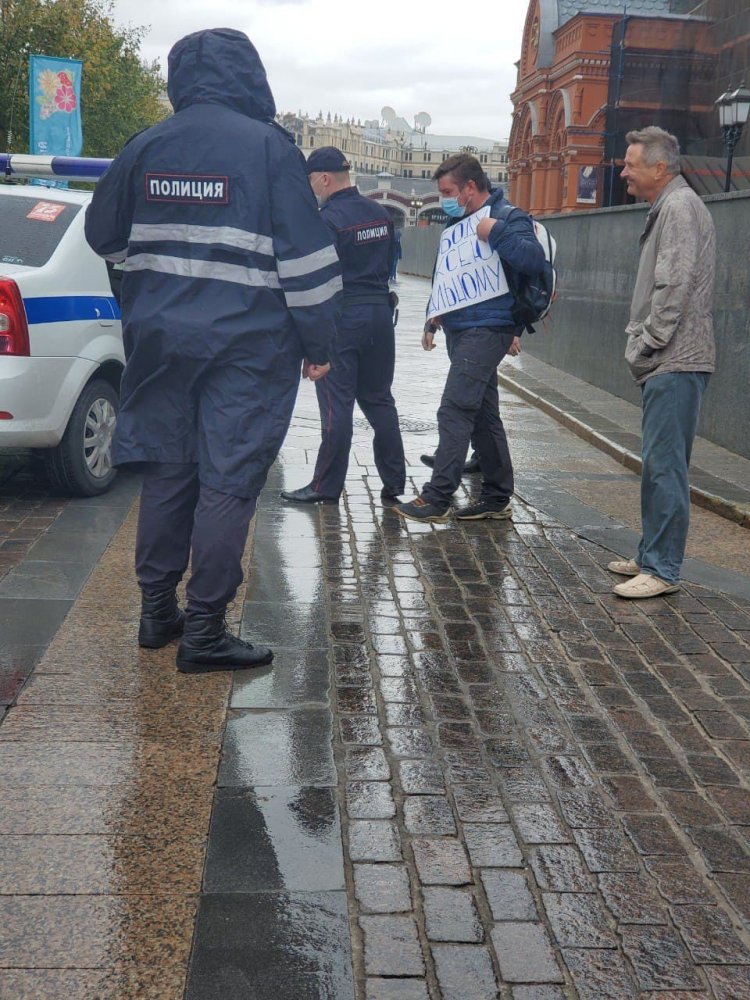 На плакате Елшанского было написано «Свободу Алексею Навальному». Сейчас его везут в отдел полиции «Китай-город». По словам задержанного, у него пытаются изъять рюкзак и телефон.