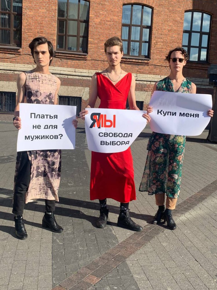 В Петербурге у ТРЦ «Галерея» задержали троих пикетчиков, вышедших с плакатами в платьях. Об этом ОВД-Инфо сообщила знакомая задержанных.