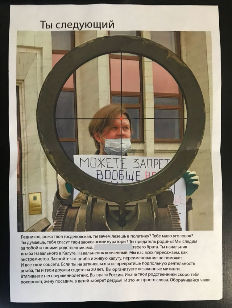 6 октября 15:17 Гражданский активист из Калуги Сергей Редников сообщил RusNews, что неизвестные подбросили ему в почтовый ящик листовку с угрозами: