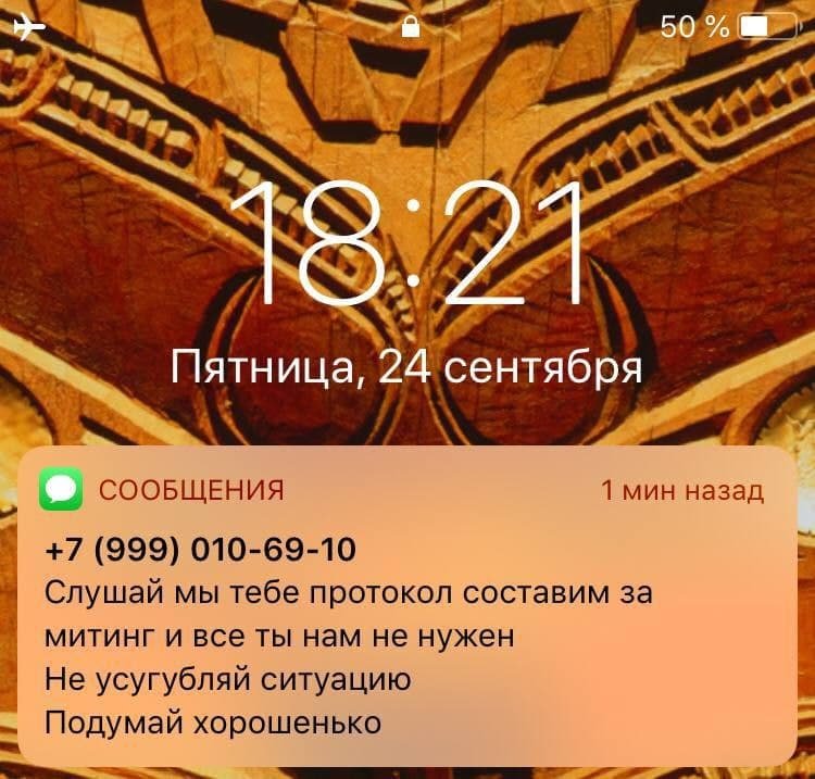 «Около 15:00 меня задержали сотрудники полиции и доставили в ОВД „Нагатинский затон“. Оформляют протокол по ст. 20.2 КоАП РФ якобы за призыв к несогласованному митингу. Поводом стала публикация мной в соцсетях информации о встрече с депутатами от КПРФ 25 сентября. Должны везти в суд, грозит арест».