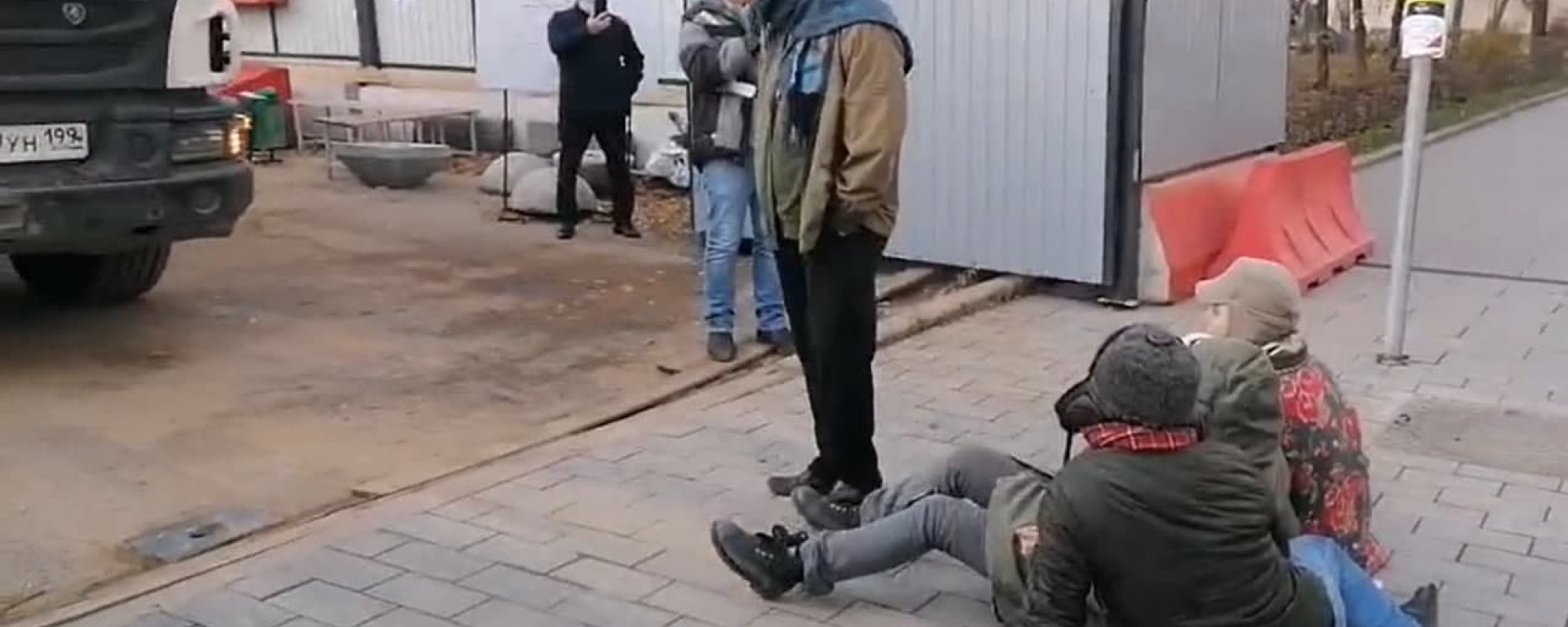 Активисты находились на тротуаре, когда КАМАЗ вывозил грунт со стройки. Полиция расценила это как препятствие работам и как неповиновение законным требованиям.