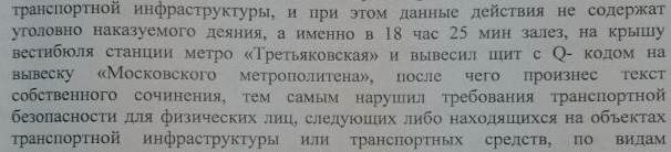 Свою акцию Марлен Чтчян провел 17 октября. Забравшись на крышу вестибюля станции «Третьяковская», он обратился к прохожим с целью «разбудить дух общественности» и с призывом быть ответственными. В конце речи он вывесил на знак метрополитена табличку с QR-кодом. Видео с акции опубликовано на ютуб-канале transfiguration.systems. QR-код ведет на страницу проекта акциониста.
