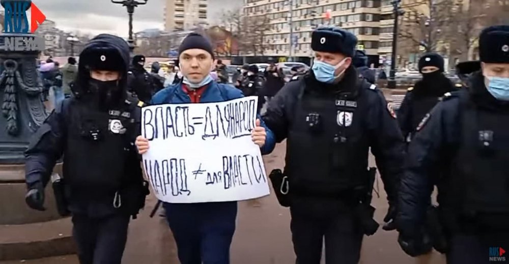14:41 Полицейские задержали еще одного пикетчика, который стоял с плакатом «Власть = для народа, народ ≠ для власти». Об этом сообщается в трансляции RUSNews.