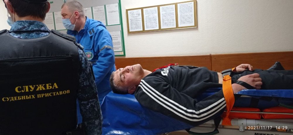 15:00 Журналиста собирались увезти на скорой, но приставы не выпускают машину с территории суда.