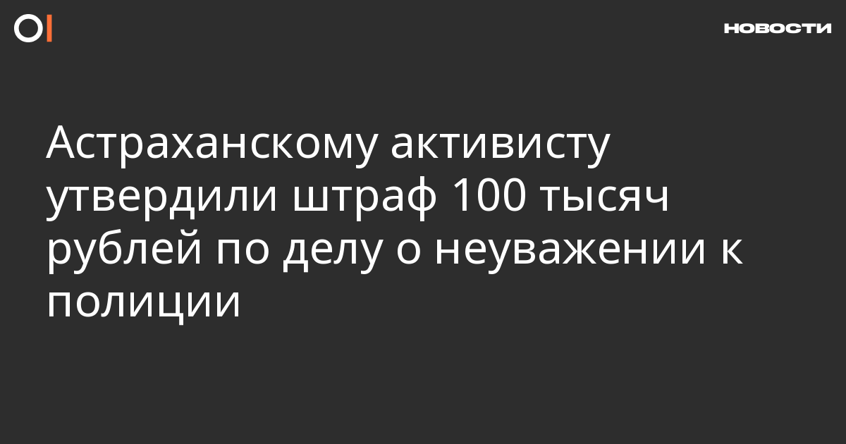 Астраханский областной суд отказал в апелляционной жалобе активисту Сергею Дерюшкину, которого оштрафовали на 100 тысяч рублей по статье о неуважении к власти (ч. 3 ст. 20.1 КоАП) из-за поста о полицейских в инстаграме. Об этом сообщает проект «Сетевые свободы».