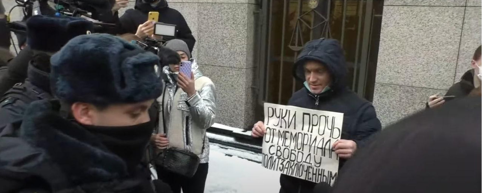 Мужчина держал в руках плакат «Руки прочь от „Мемориала“. Свободу политзаключенным».