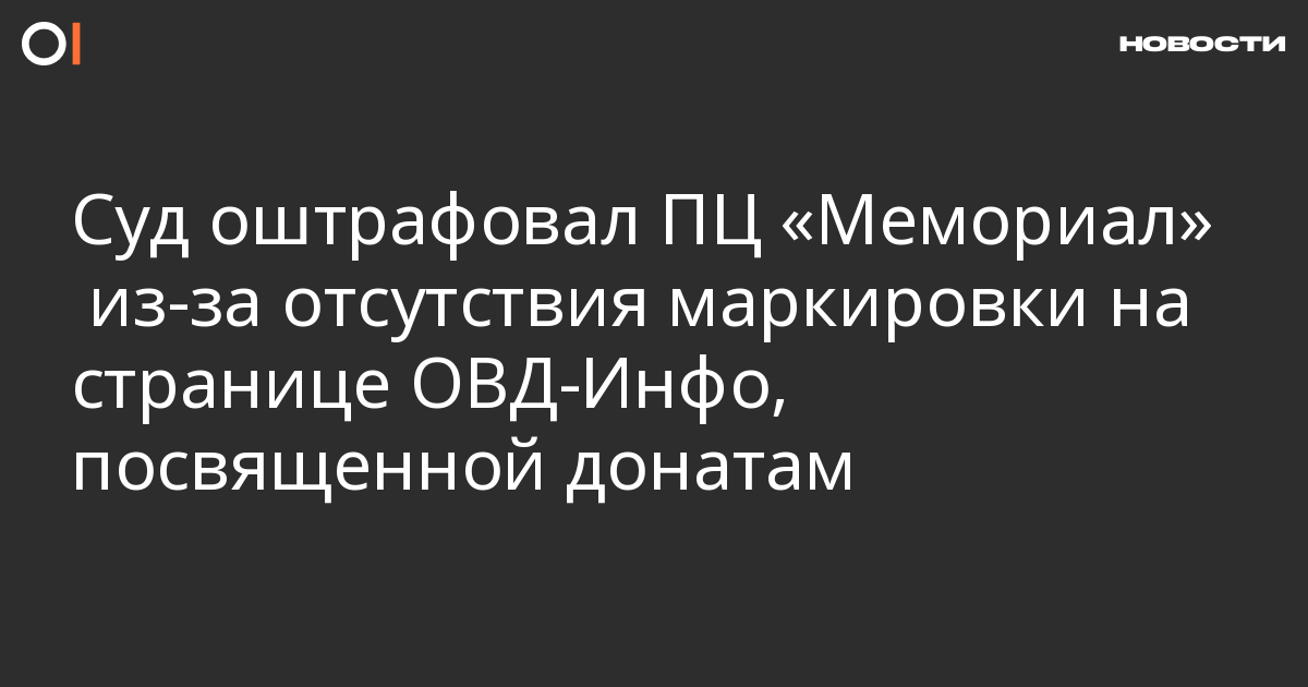 Тверской районный суд оштрафовал Правозащитный центр «Мемориал» на полмиллиона рублей из-за отсутствия маркировки иностранного агента на странице ОВД-Инфо, посвященной сбору пожертвований на работу проекта. Об этом сообщает сооснователь ОВД-Инфо Даниил Бейлинсон.