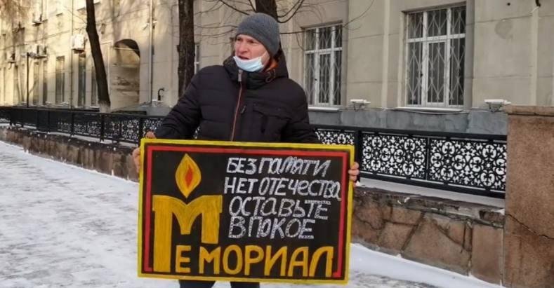 Мужчина стоял с плакатом «Без памяти нет отечества. Оставьте в покое Мемориал». Ему вменяют несоблюдение мер при чрезвычайной ситуации.